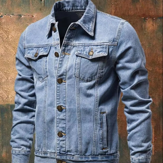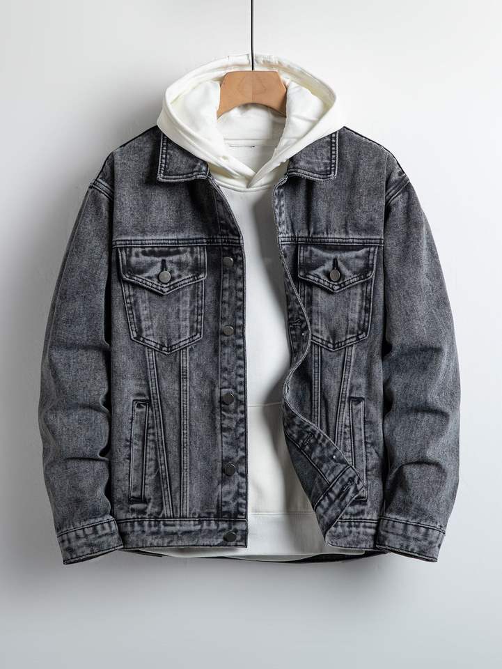 แจ็กเก็ตผ้ายีนส์สำหรับผู้ชายเสื้อแจ็คเก็ตผ้าฝ้าย100% ด้านหน้าติดกระดุมเป็นมิตรกับสิ่งแวดล้อมสไตล์2025ที่กำลังมาแรง