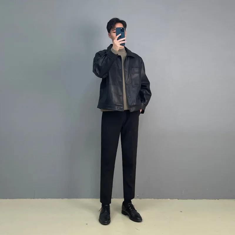 แจ็คเก็ตมอเตอร์ไซค์ลำลองสไตล์วินเทจสำหรับผู้ชาย ทรงหลวม ปกจีน หนังวัว รักษ์โลก สไตล์เกาหลี