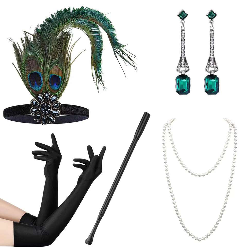 ชุดเครื่องประดับคอสเพลย์สไตล์วินเทจยุค 1920 สำหรับงานปาร์ตี้แบบแกสบี้ ประกอบด้วยที่คาดผมประดับขนนกและคริสตัล สร้อยคอไข่มุก ต่างหู และถุงมือสำหรับผู้หญิง