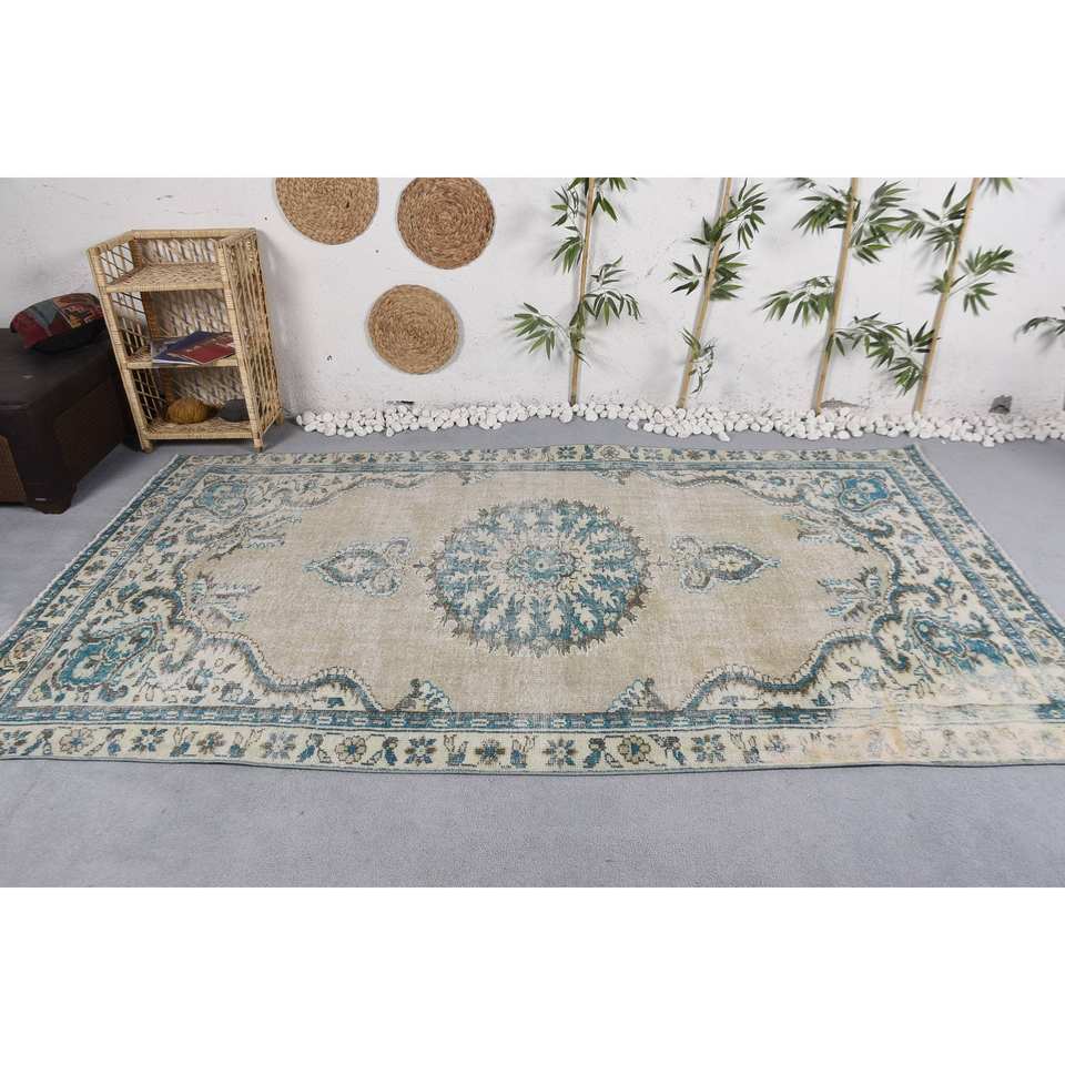 พรมขนแกะวินเทจแบบผสมผสานลายปะต่อสีเบจและน้ำเงินสี่เหลี่ยมขนาด5.3X9.4ฟุตงานแฮนด์เมดทำด้วยมือทำจากยางรองสำหรับห้องนั่งเล่น