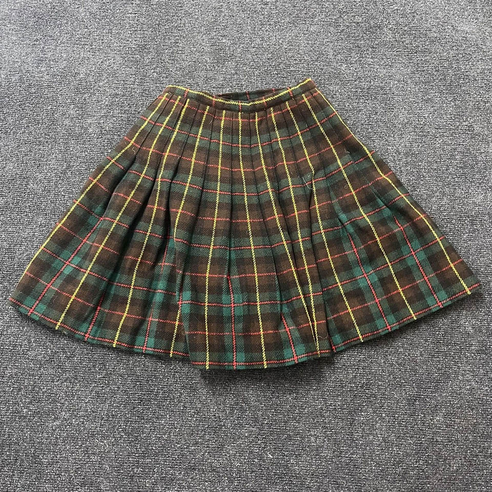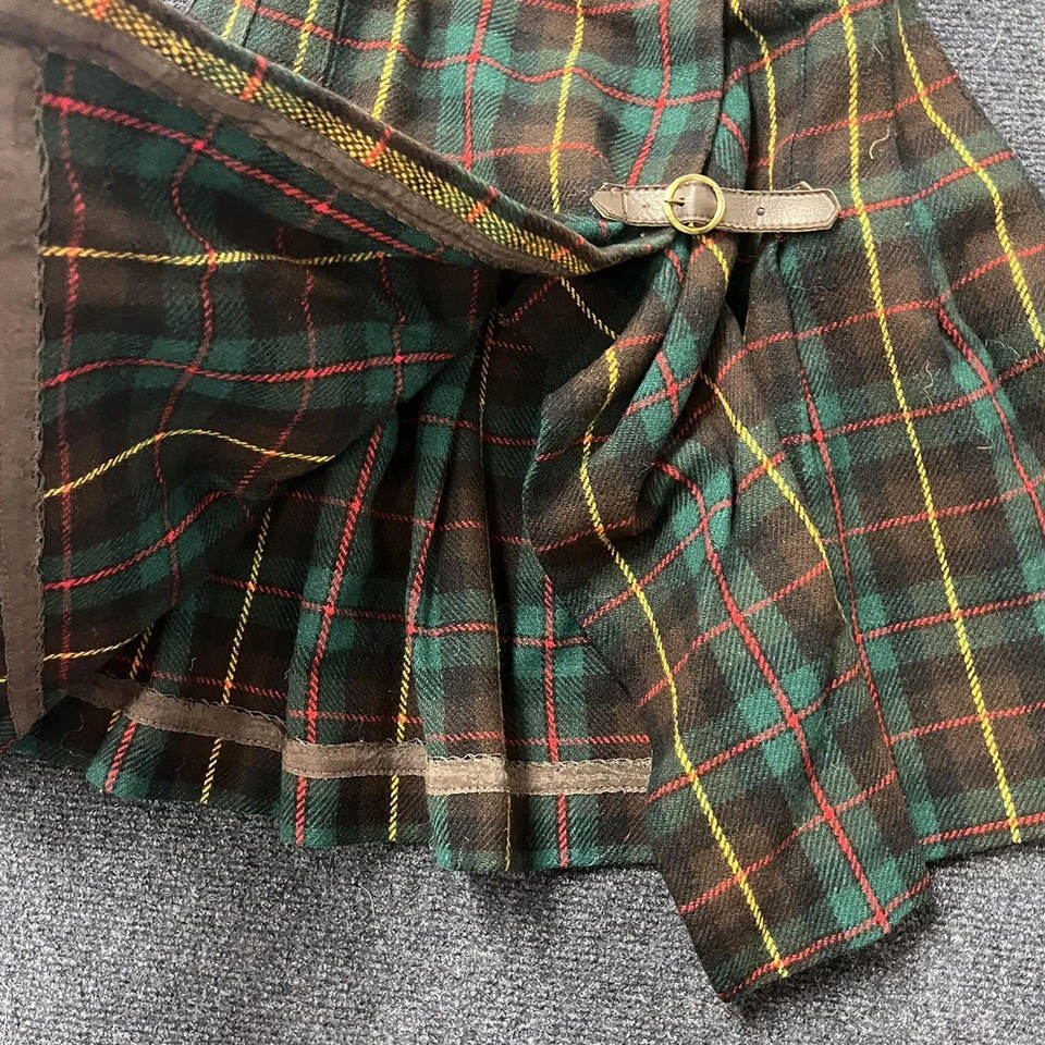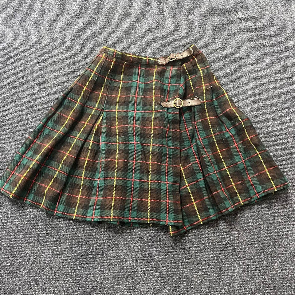 กระโปรงทำมือผ้าวูลวินเทจ ลายสก็อตสีเขียวสำหรับผู้หญิง แบบจีบผูกเอว มีหัวเข็มขัด สไตล์นักเรียนหญิง มินิคิลท์ 2026