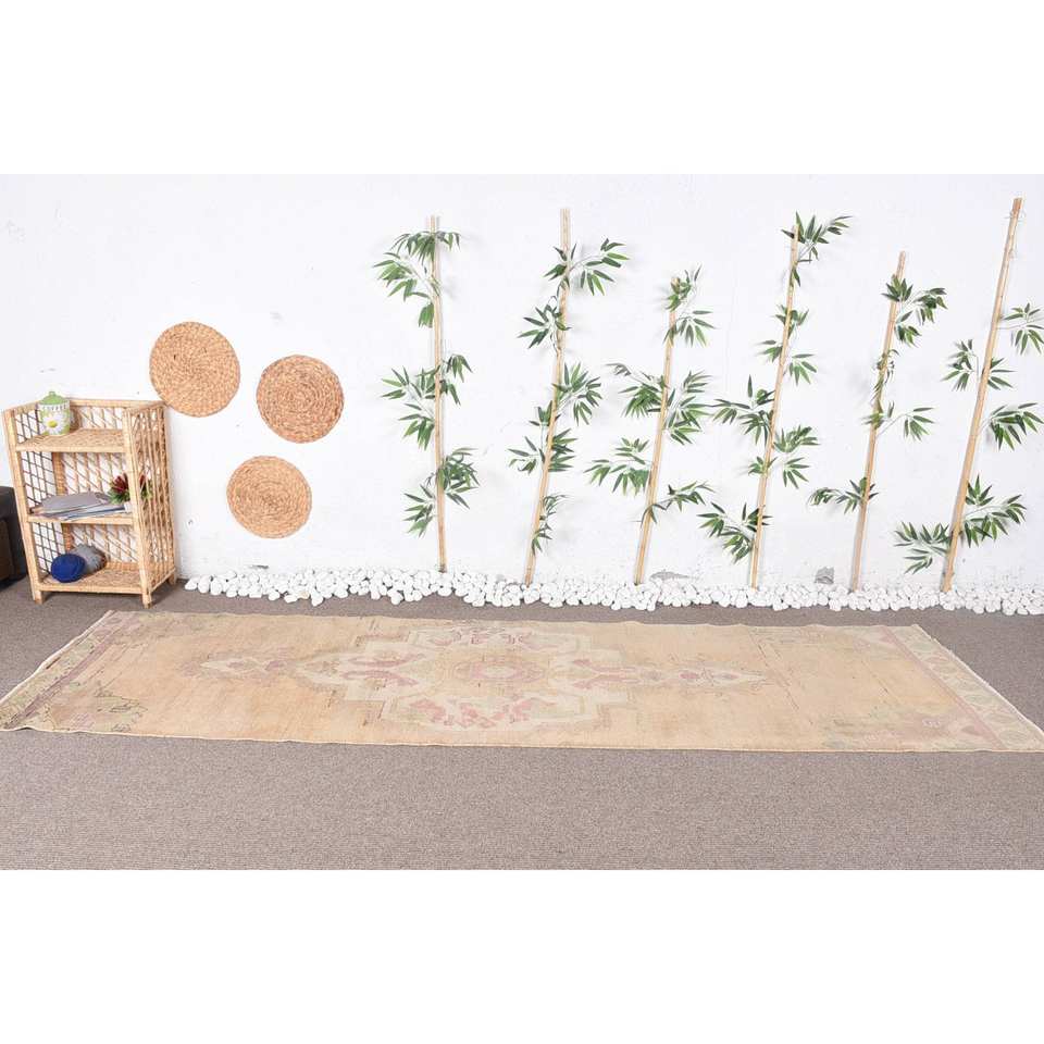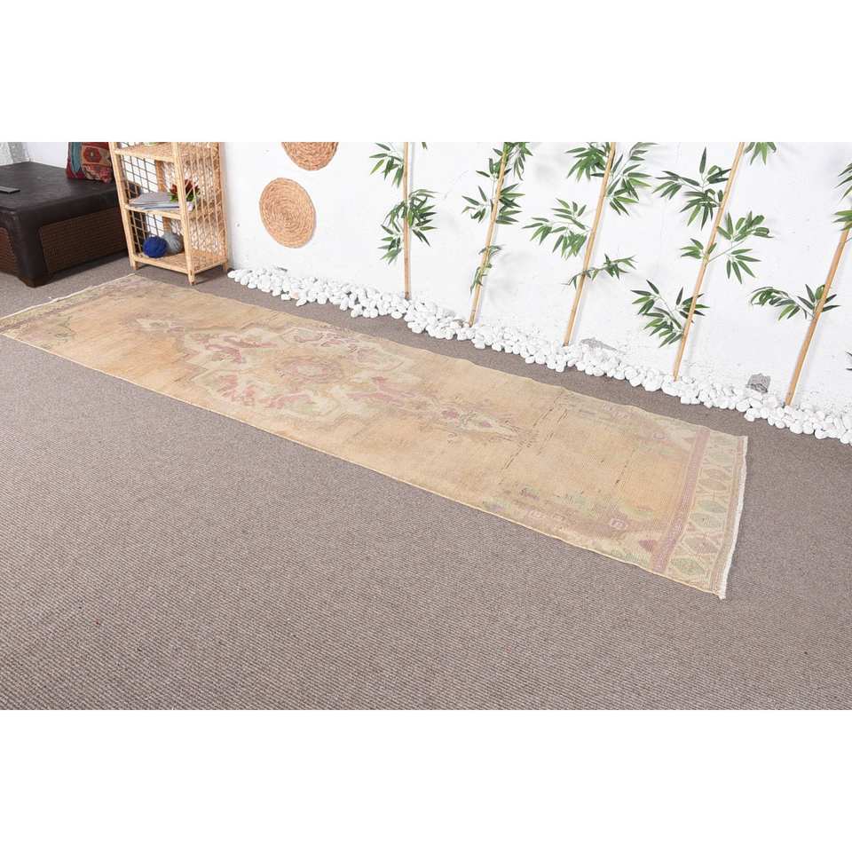 พรมขนสัตว์วินเทจพรมกำมะหยี่สีเบจและสีชมพูคลาสสิกทำด้วยมือรูปสี่เหลี่ยมผืนผ้าการเย็บปะติดปะต่อกันออกแบบสำหรับห้องนั่งเล่น (3 x 10.7ft)