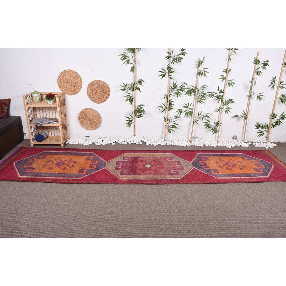 พรมขนสัตว์แนววินเทจสีส้มแดงขนาดใหญ่9x12ทรงสี่เหลี่ยมสไตล์โบฮีเมียนลายปะต่อทรงเรขาคณิตสำหรับโถงทางเดินยางขนาด3.1x12.5ฟุต