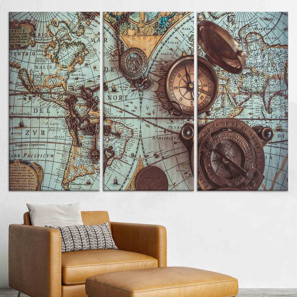 ภาพพิมพ์แผนที่โลกสไตล์วินเทจบนผ้าแคนวาส: ศิลปะติดผนังรูปเข็มทิศทองเหลืองสุดหรู ชุดผ้าแคนวาส 3 ชิ้น