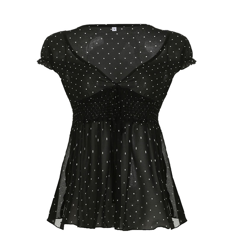 เสื้อยืดถักสไตล์วินเทจ Y2K สำหรับฤดูร้อน แขนสั้น คอวี ลายจุด แต่งผ้าตาข่าย ปะติดปะต่อ จับจีบเอวสูง สีตัดกัน สไตล์ลำลอง