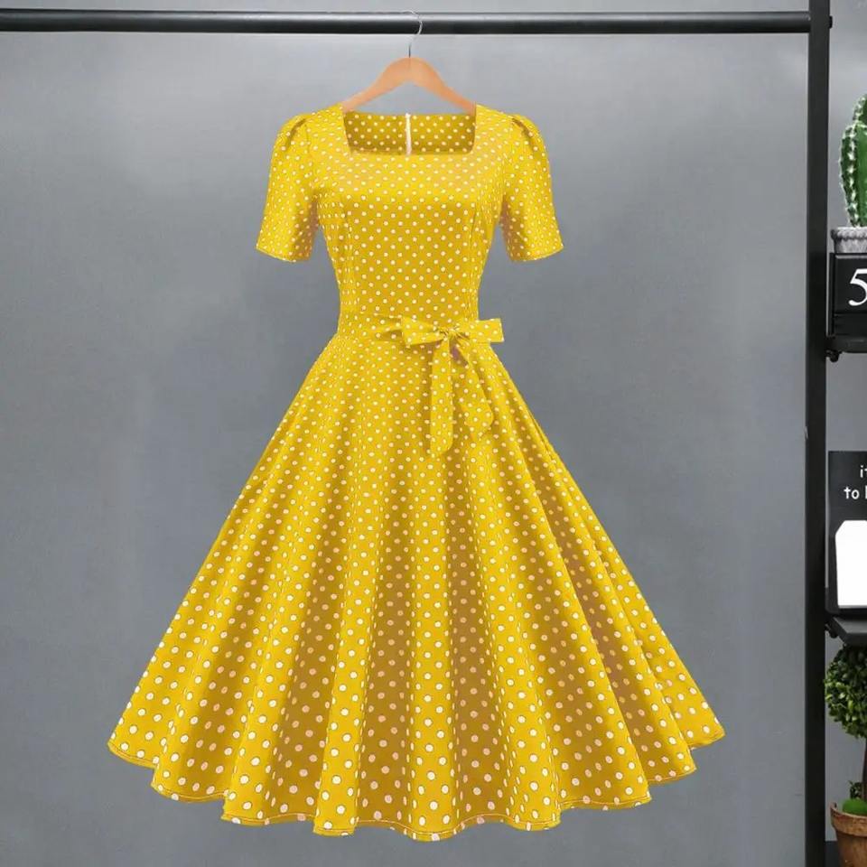 ชุดเดรสวินเทจคอเหลี่ยมสไตล์วินเทจของผู้หญิงชุดเดรสวินเทจลายจุดเล็กๆดีไซน์ย้อนยุคเหนือกาลเวลา