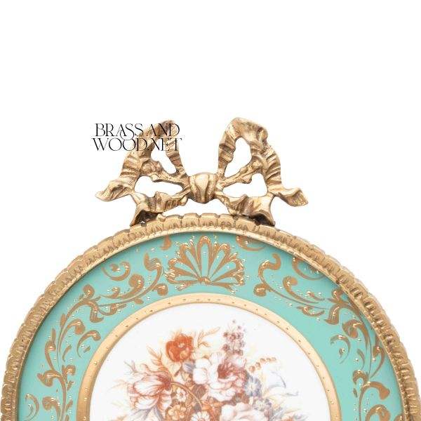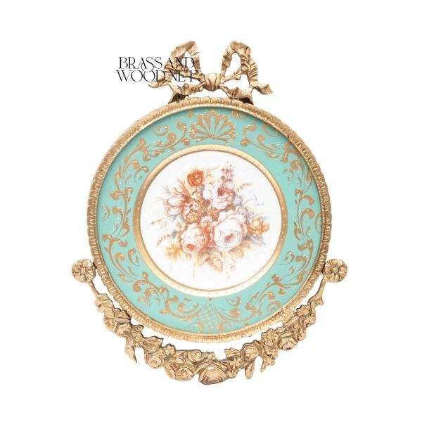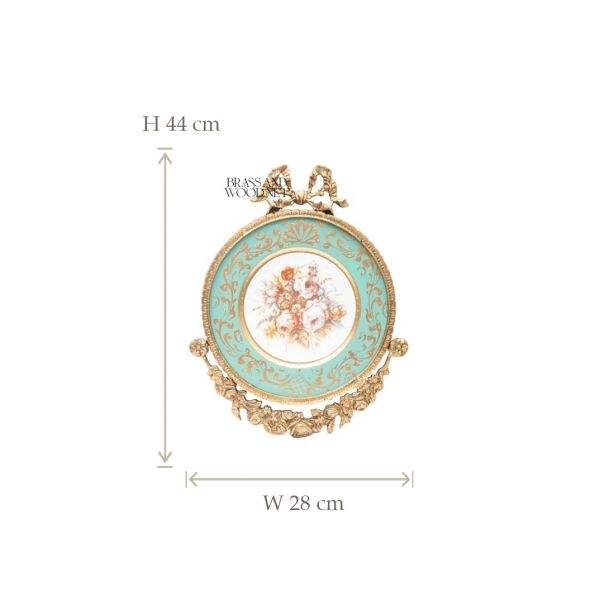 กรอบสีทองหรูหราวินเทจที่มีพื้นหลังสีฟ้าครามและภาพวาดดอกไม้ที่มีดอกกุหลาบตกแต่งศิลปะผนังโบราณ