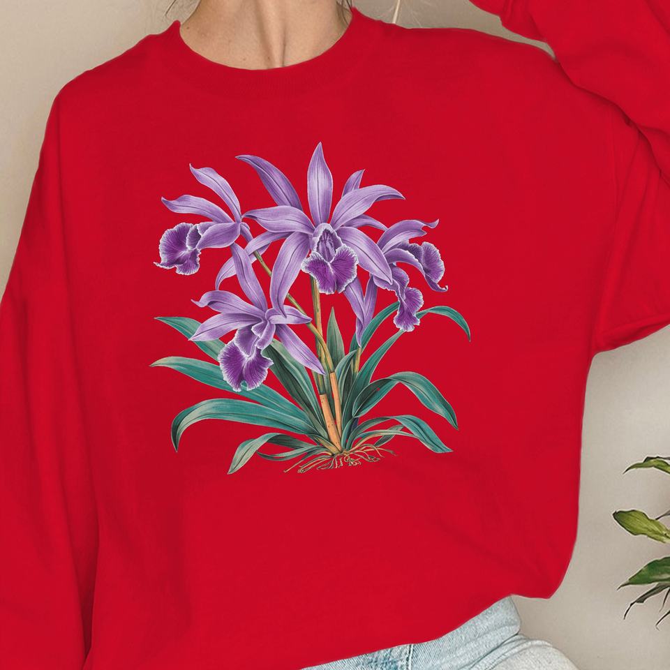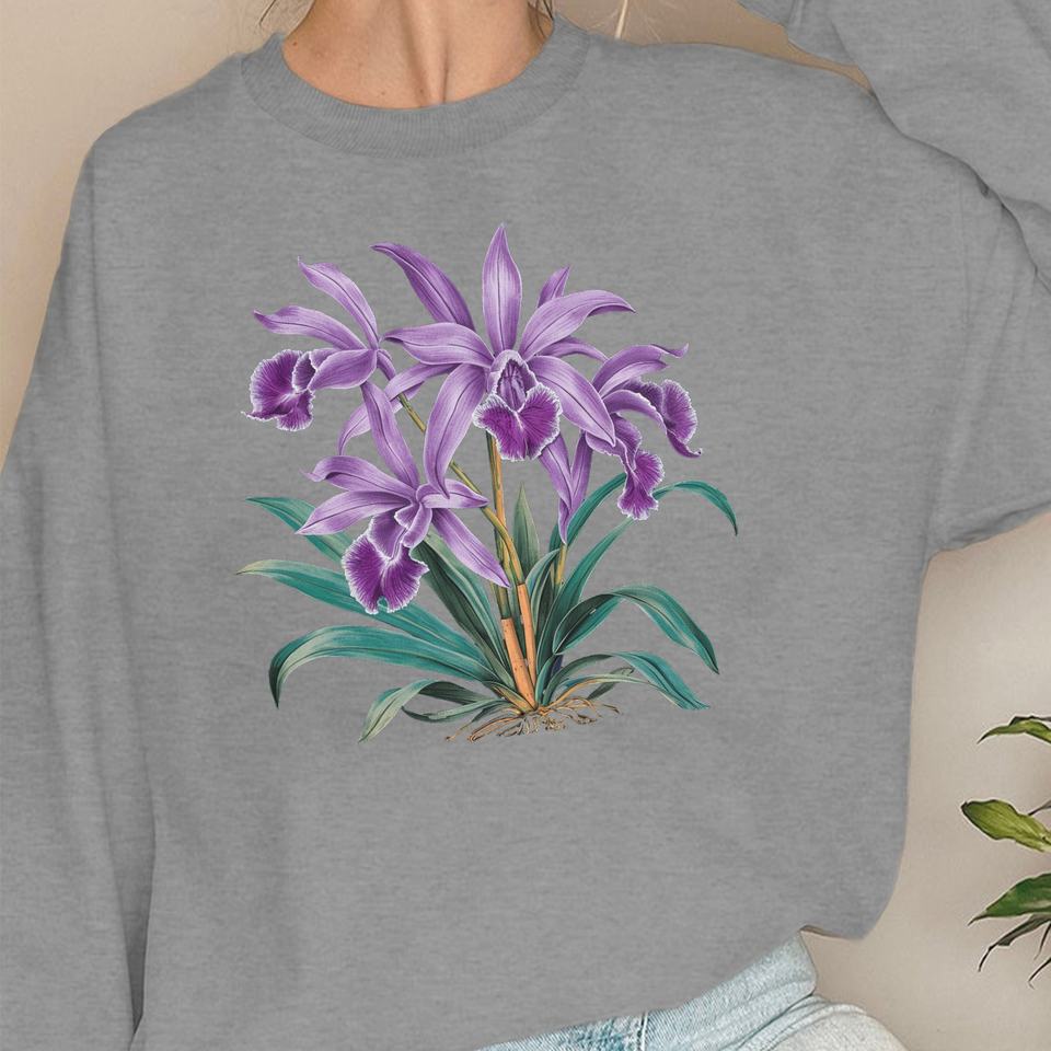 เสื้อสเวตเชิ้ตผู้หญิงแบบลำลองพิมพ์ลายดีไซน์กล้วยไม้สไตล์วินเทจ