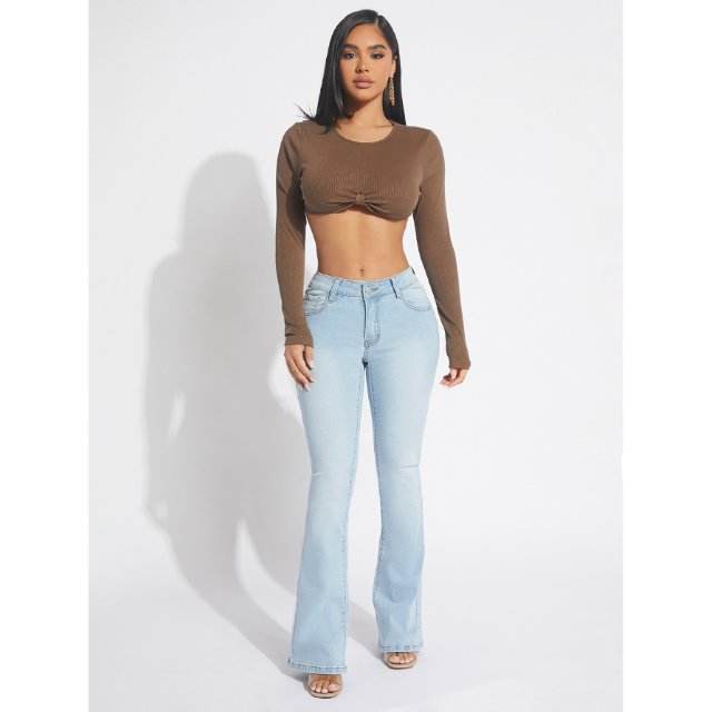ข้อมูลจำเพาะ:High waist design for flattering fit., Bell bottom flared leg style., Premium quality denim fabric., Soft and comfortable feel., Stretch material for easy movement., Durable stitching for long wear., Stylish vintage inspired look., Suitable for casual and daily wear., Easy to pair with tops and footwear., Available in multiple sizes and washes.