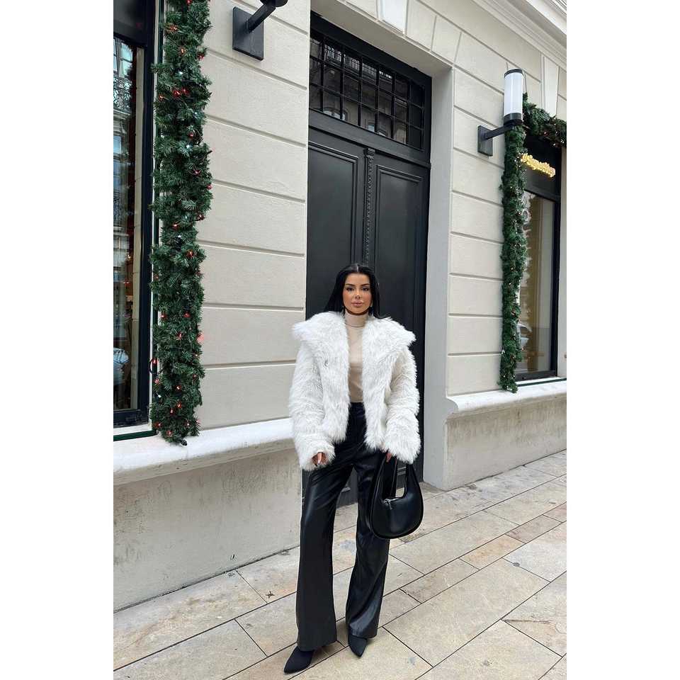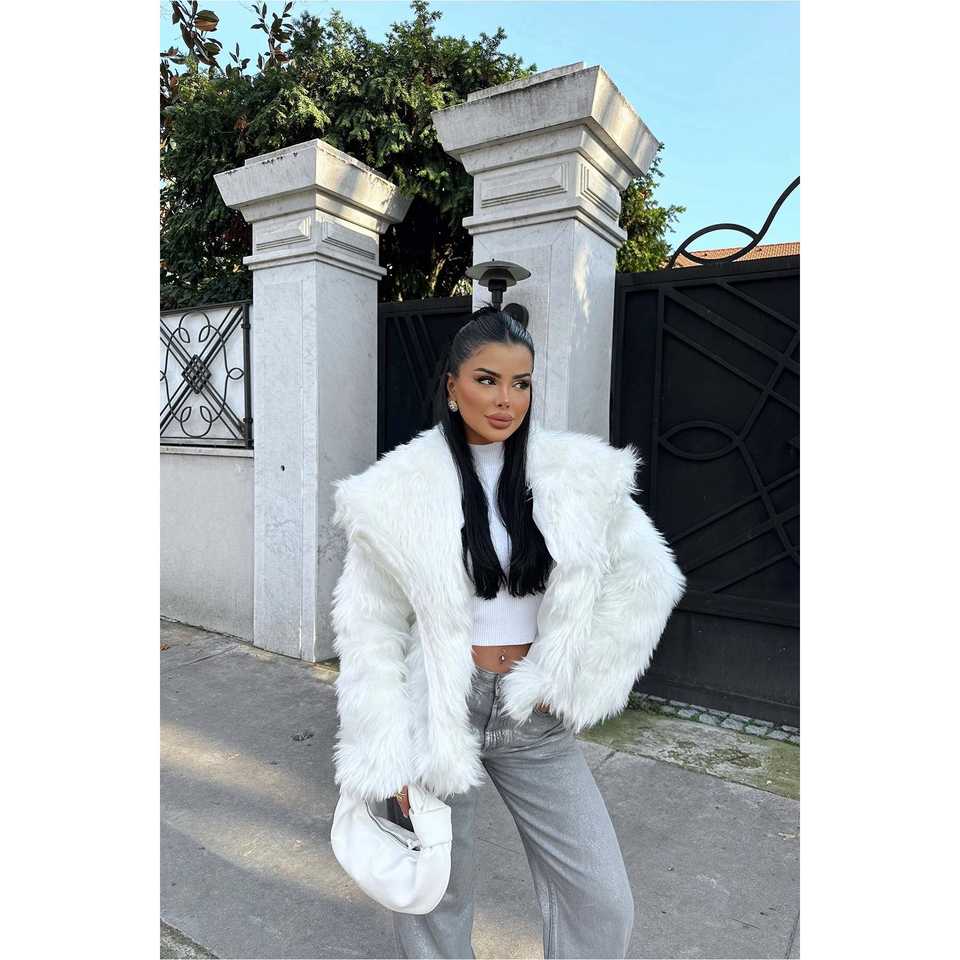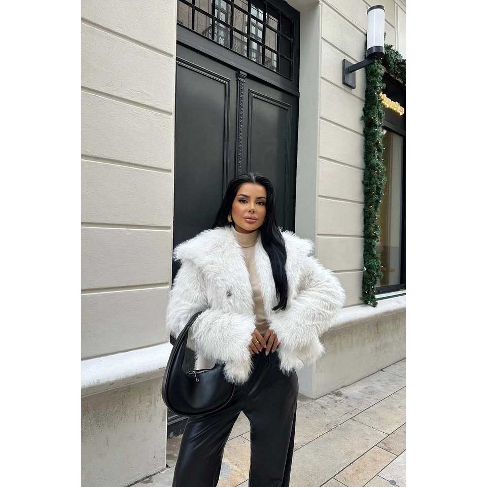 เสื้อแจ็คเก็ตขนเฟอร์สีขาวตกแต่งสไตล์วินเทจ ปิดกระดุมเม็ดเดียว ผ้าเดนิมยาวพิมพ์ลายขนมิงค์และขนฟ็อกซ์ ย้อมสี บุด้วยใยฝ้าย