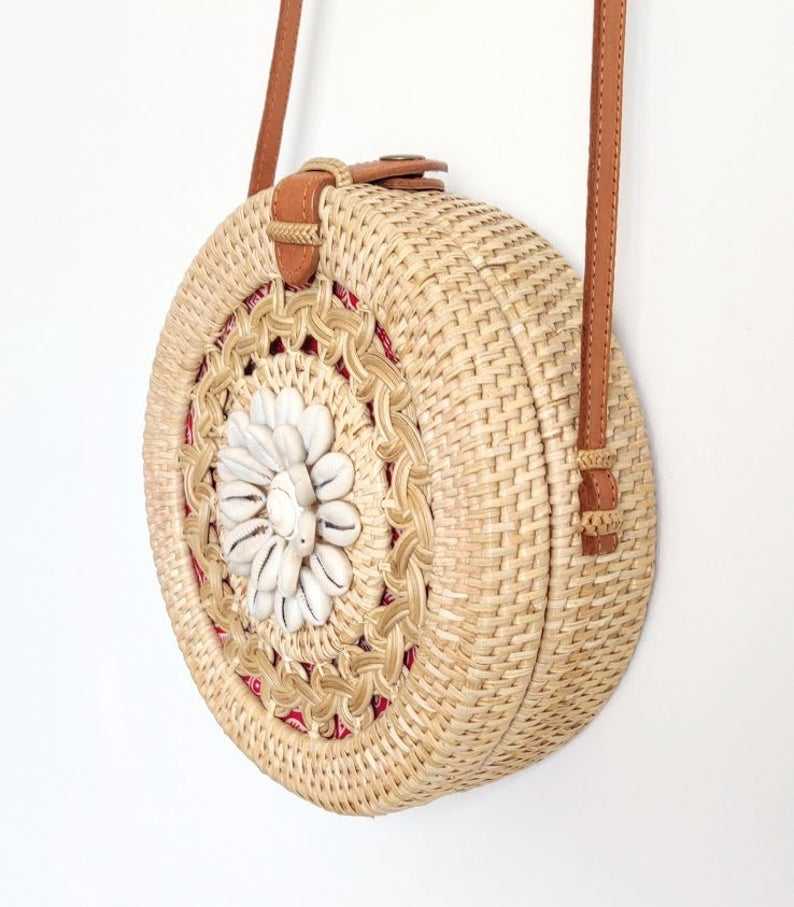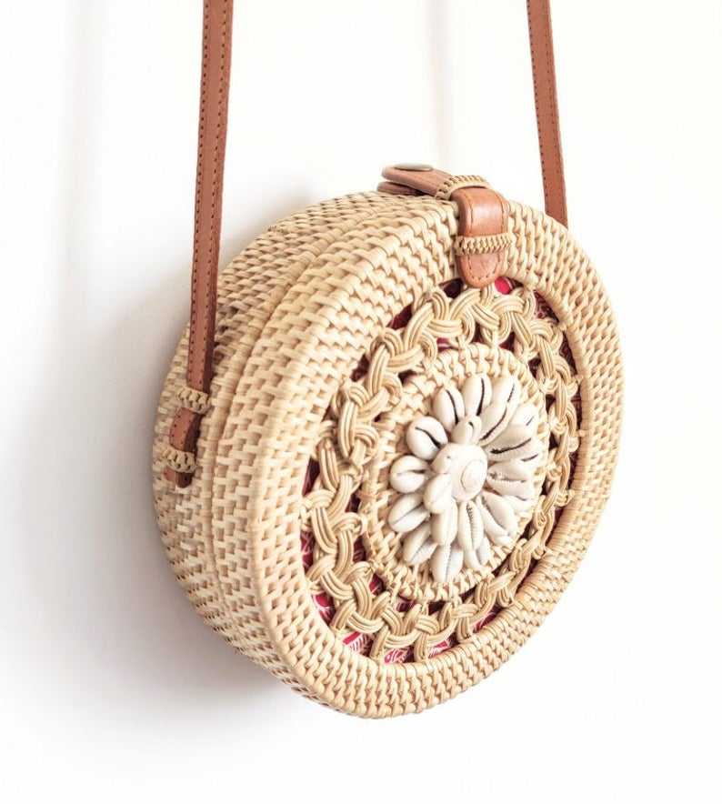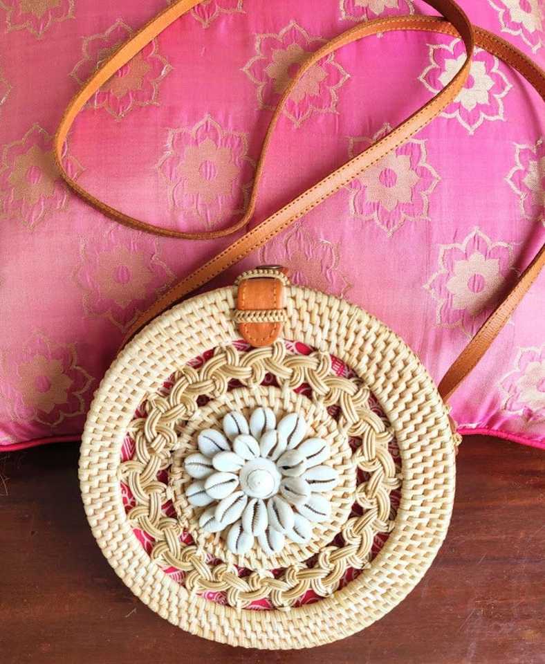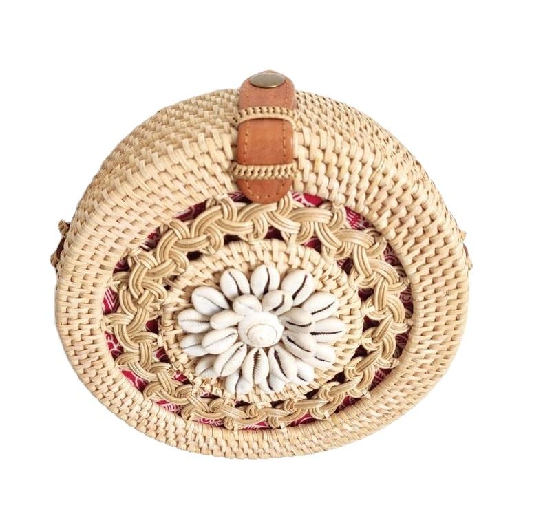 กระเป๋าสะพายไหล่แบบมีหูหิ้วเดี่ยวสไตล์วินเทจพร้อมเปลือกหอยและดีไซน์ถักเปียลายดอกไม้