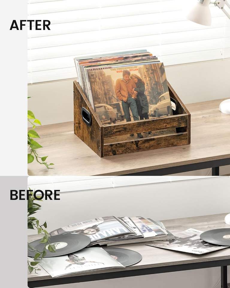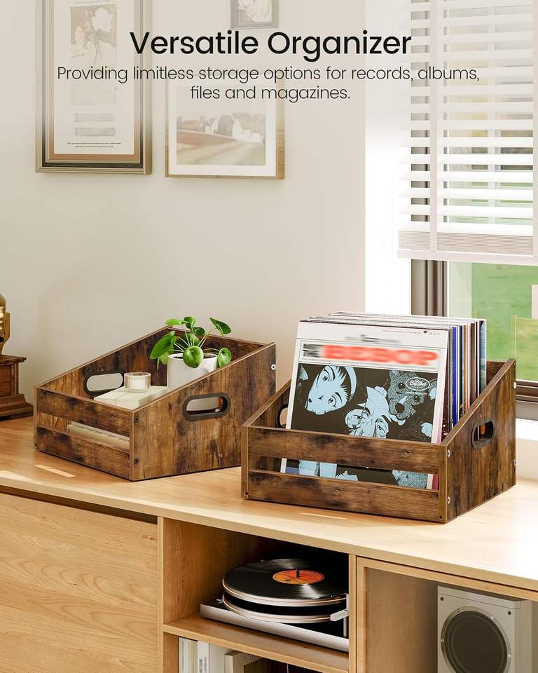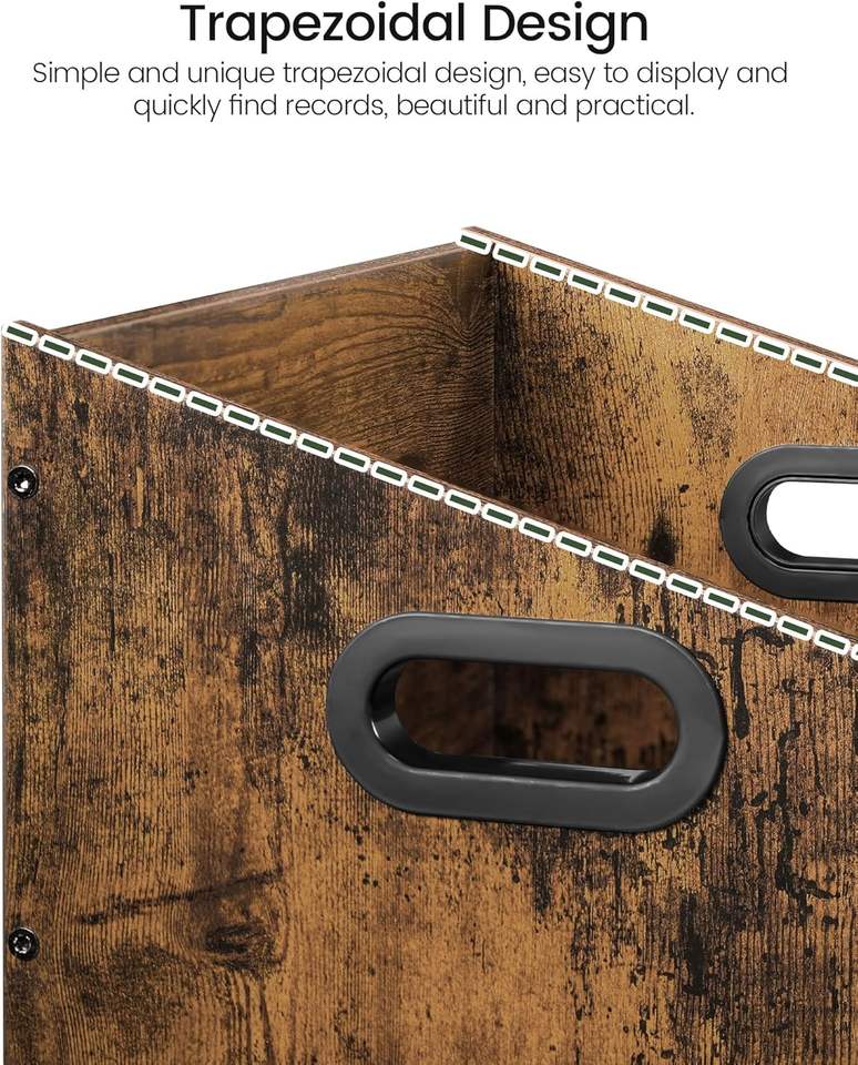 ลังจัดเก็บแผ่นเสียงไวนิลแบบชนบทลังไม้สี่เหลี่ยมคางหมูสีน้ำตาลวินเทจถือแผ่นเสียงไวนิลเป็นที่เก็บอัลบั้มบนเดสก์ท็อป