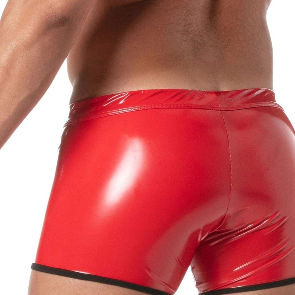 กางเกงขาสั้นไวนิลสีแดงสำหรับผู้ชาย สไตล์เฟติช คลับแวร์ เงา หนา แต่งลูกไม้ เป็นมิตรกับสิ่งแวดล้อม เซ็กซี่