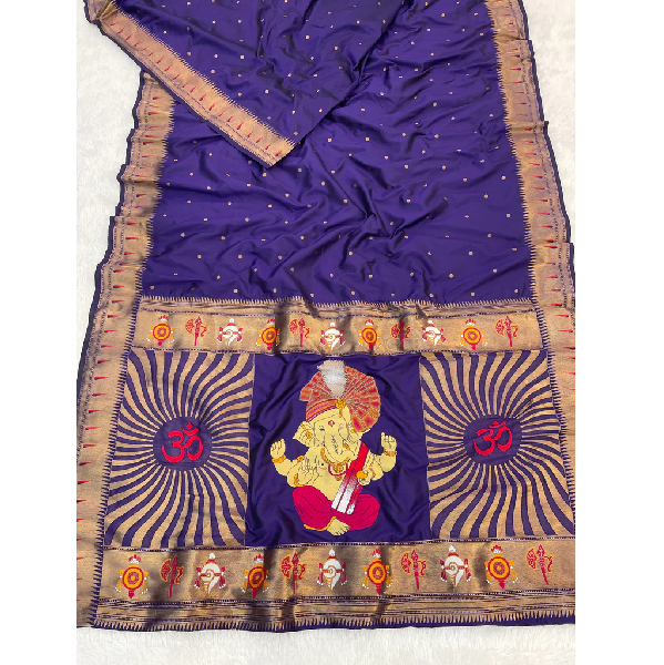 ส่าหรีผ้าไหมสีม่วงที่มีลวดลายเทพเจ้ากาปาติแบบ zari ทอที่สวยงามและขอบแบบดั้งเดิมเพื่อให้รูปลักษณ์ที่ศักดิ์สิทธิ์และสง่างาม