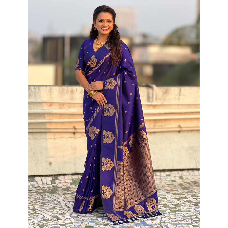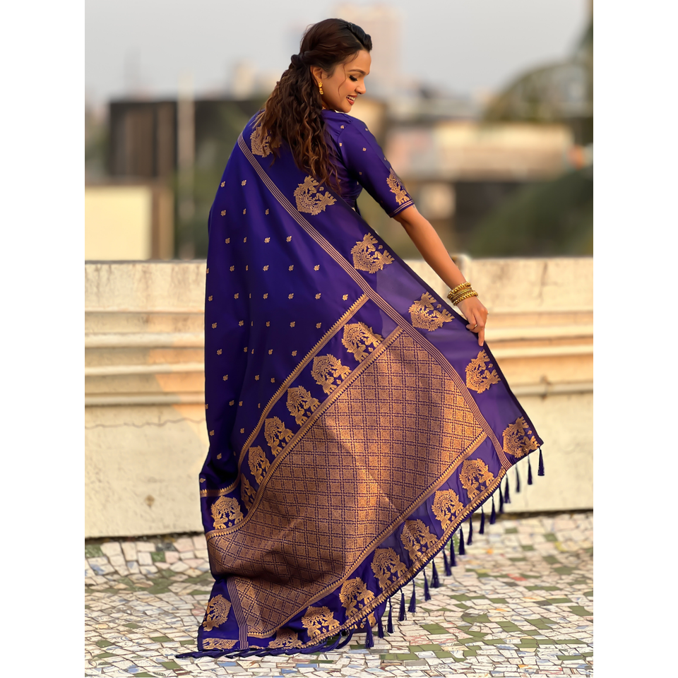 ผ้าไหมซารีสีม่วงแบบดั้งเดิมทอแบบซารี ยี่ห้อ Elite Weaves น้ำหนัก 600 กรัม เสื้อผ้าอินเดียและปากีสถาน