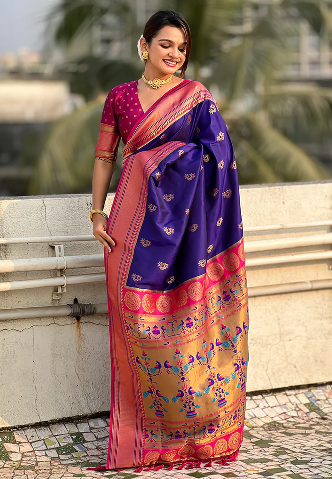 ผ้าไหม yeola paithani Saree ที่มีลวดลาย zari ทอที่สง่างามและเส้นขอบที่ตัดกันเพื่อให้ดูสง่างาม