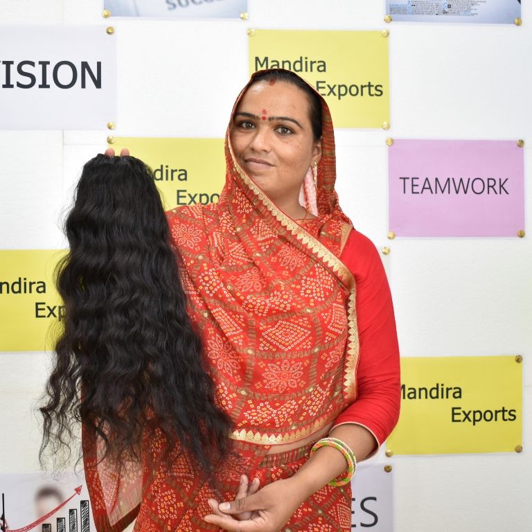 ผมต่อแบบเวอร์จิ้นเวนเดอร์ สีดำ แบบหยิกเป็นลอนธรรมชาติ แบบมัดเป็นช่อ ถักด้วยเครื่องจักรแบบดับเบิ้ลเวฟท์ ผมแท้จากวัดอินเดีย แบบเรมี่