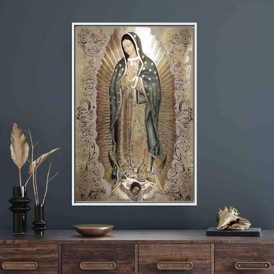 ศิลปะติดผนังพระแม่กัวดาลูป: งานศิลปะบนผ้าใบพิมพ์ลายสวยงาม พร้อมกรอบสีขาว