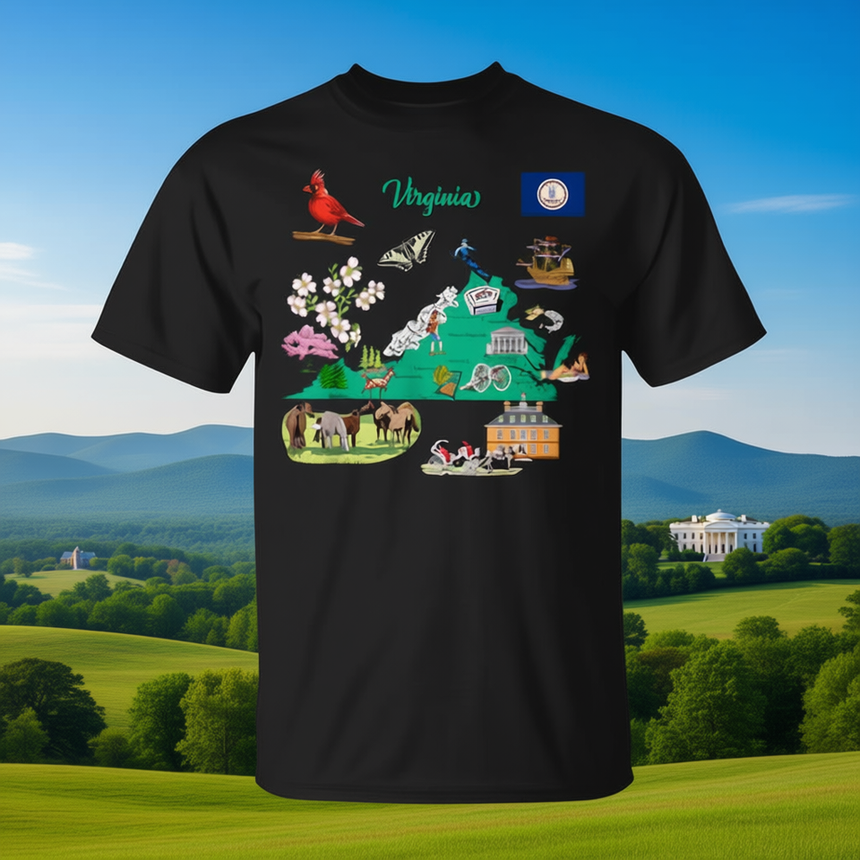 เสื้อยืดแผนที่ท่องเที่ยวเวอร์จิเนียพร้อมสถานที่สำคัญและสัญลักษณ์ชื่อดัง เสื้อผ้าส่งเสริมการขายของสหรัฐอเมริกา