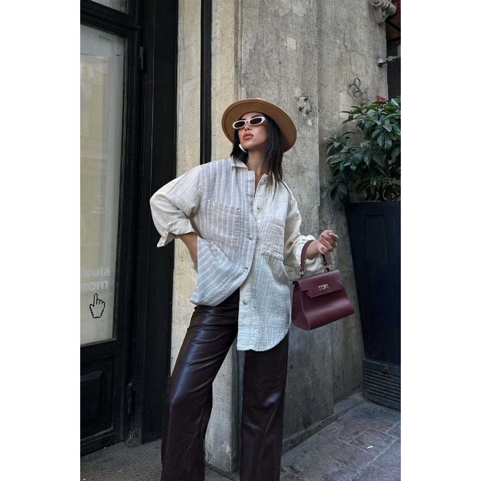 เสื้อเชิ้ตโอเวอร์ไซส์ผ้าลินินลายทางสำหรับผู้หญิง ยี่ห้อ Vitruvia สีธรรมชาติ ระบายอากาศได้ดี สวมใส่สบายในชีวิตประจำวัน