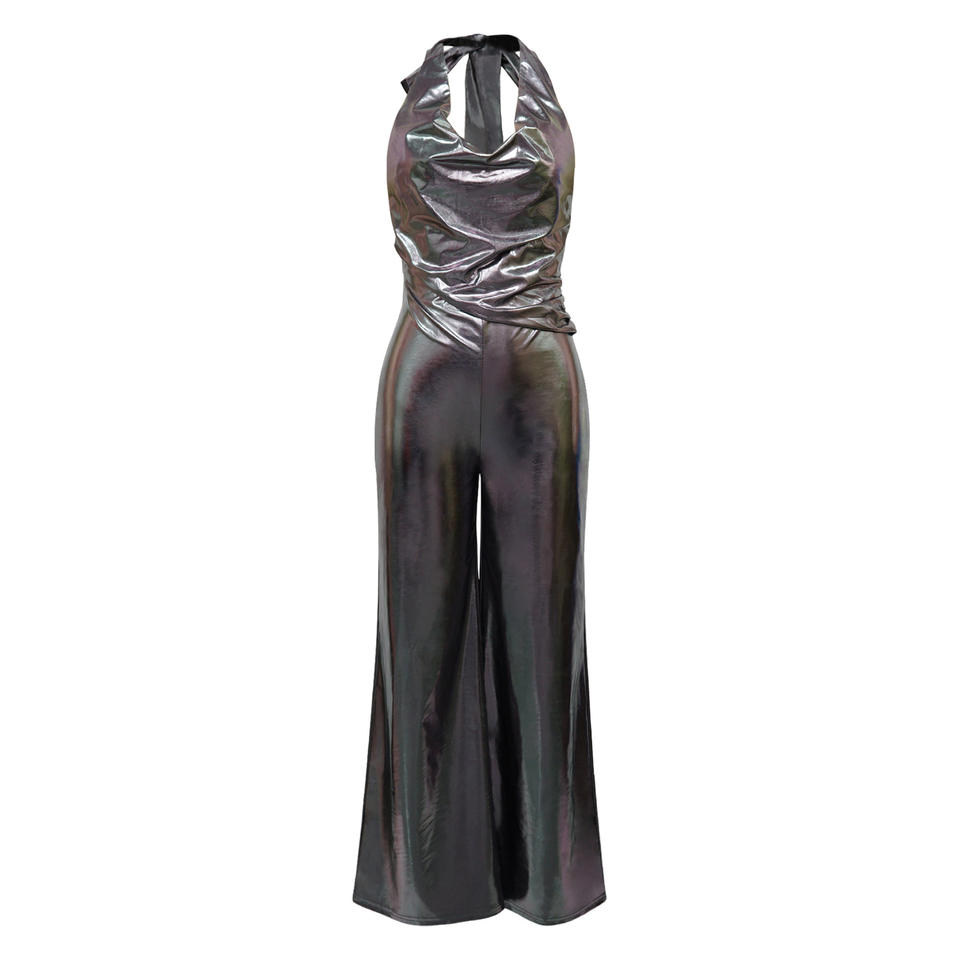 วิบลูค Z306JP02 จั๊มสูทลำลองสำหรับผู้หญิง คอวี สายผูกหลัง จั๊มสูทขากว้างสำหรับผู้หญิง ทรงเข้ารูป