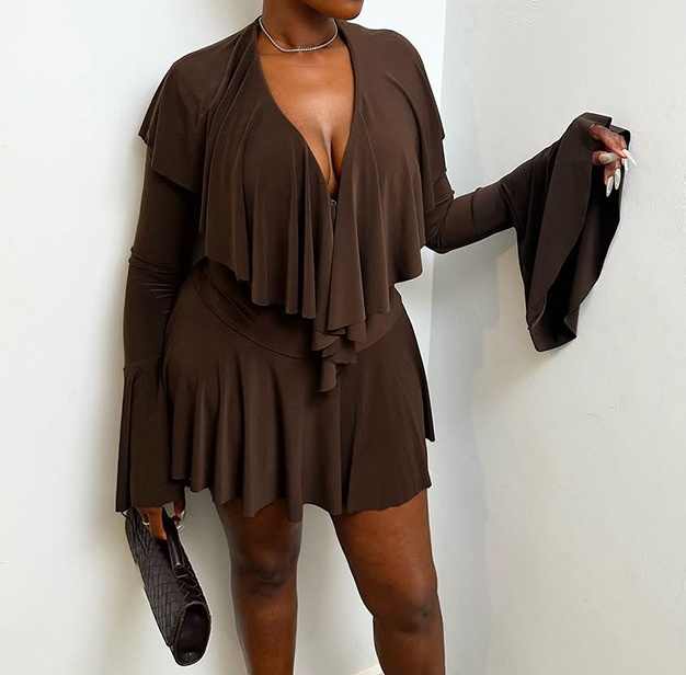 Viviblook เดรสมินิเดรสคอวีลึกแขนยาวของผู้หญิงสีพื้นใหม่สำหรับฤดูใบไม้ร่วงของ C25DS279