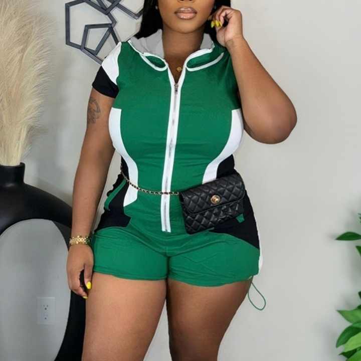Viviblook ชุดรอมเปอร์ชิ้นเดียวแบบมีซิปแขนสั้นสำหรับผู้หญิงชุดรอมเปอร์รัดรูปชิ้นเดียวมีฮู้ดสำหรับฤดูร้อน D24RP698
