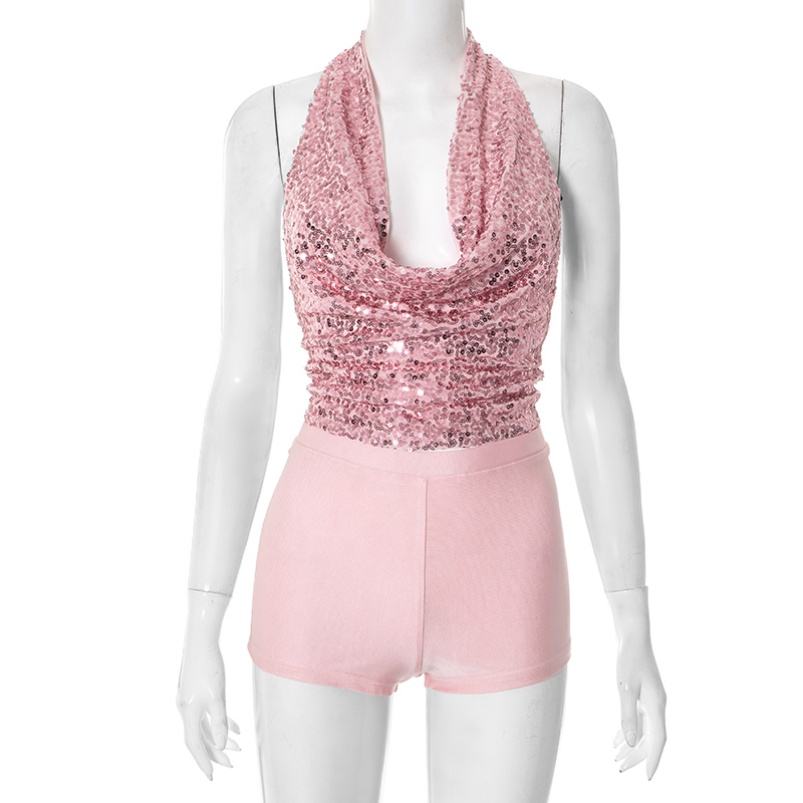 Viviblook ชุดกางเกงขาสั้น2ชิ้นสำหรับผู้หญิงชุด Y2K D25ST303 2025ขาสั้นประดับด้วยเลื่อมเสื้อครอปทรงสวิง