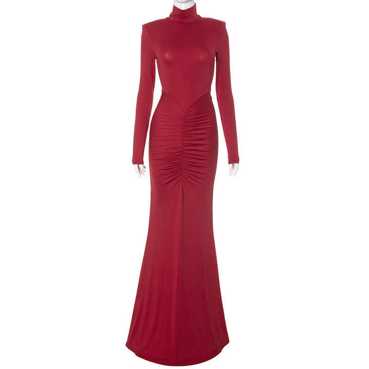 วิวิบลุค F24DS260 ชุดราตรีผู้หญิง ชุดเดรสแขนยาวคอสูงพร้อมแผ่นรองไหล่ ชุดเดรสหางปลาแบบจับจีบยาวถึงพื้น