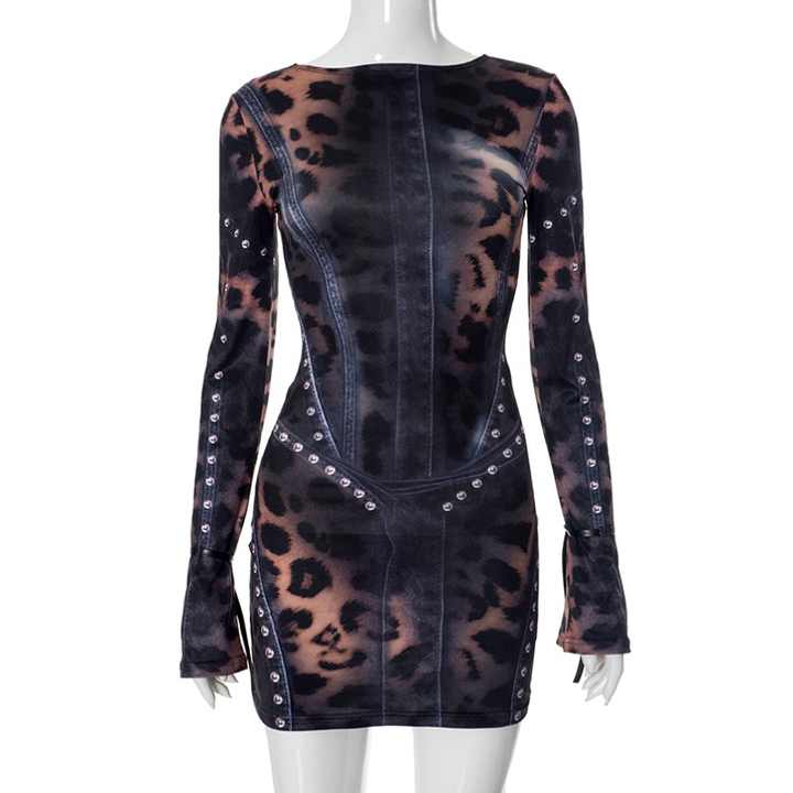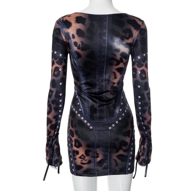 Viviblook เดรสลำลอง F24DS269สตรีทแวร์เดรสสั้นแขนยาวพิมพ์ลายเสือดาวเซ็กซี่2025สำหรับผู้หญิงเสื้อผ้า