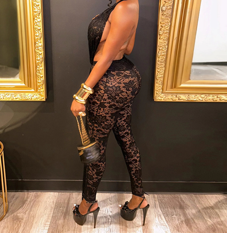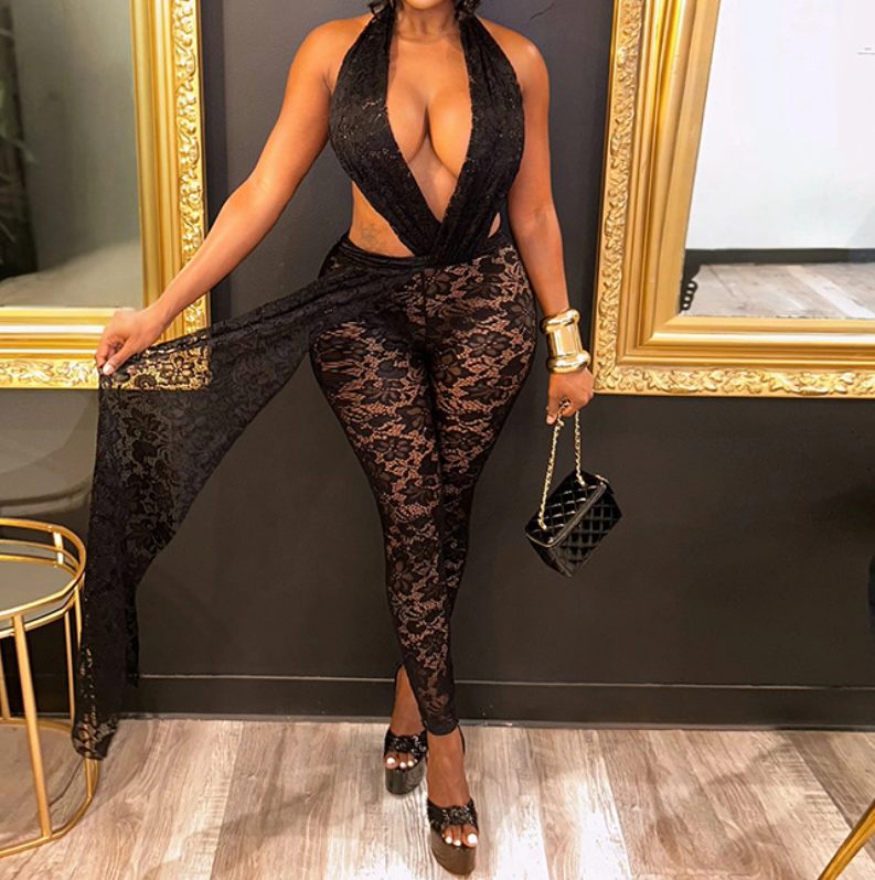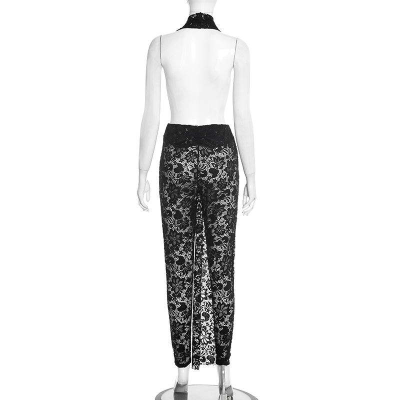 ชุดจั๊มสูทวันพีซผู้หญิง Viviblook รุ่น J25JP483 สำหรับฤดูร้อน แบบผูกคอ เปิดหลัง ผ้าซีทรู แต่งลูกไม้ เอวสูง