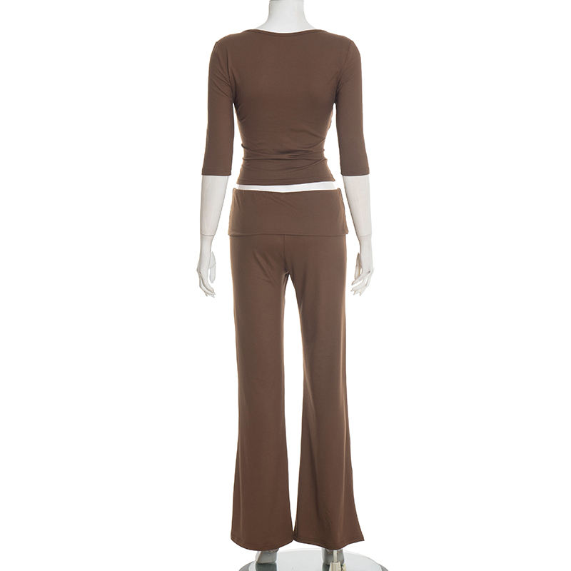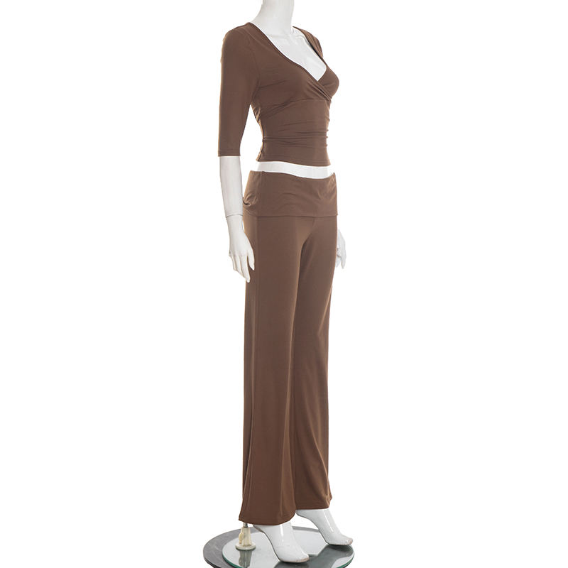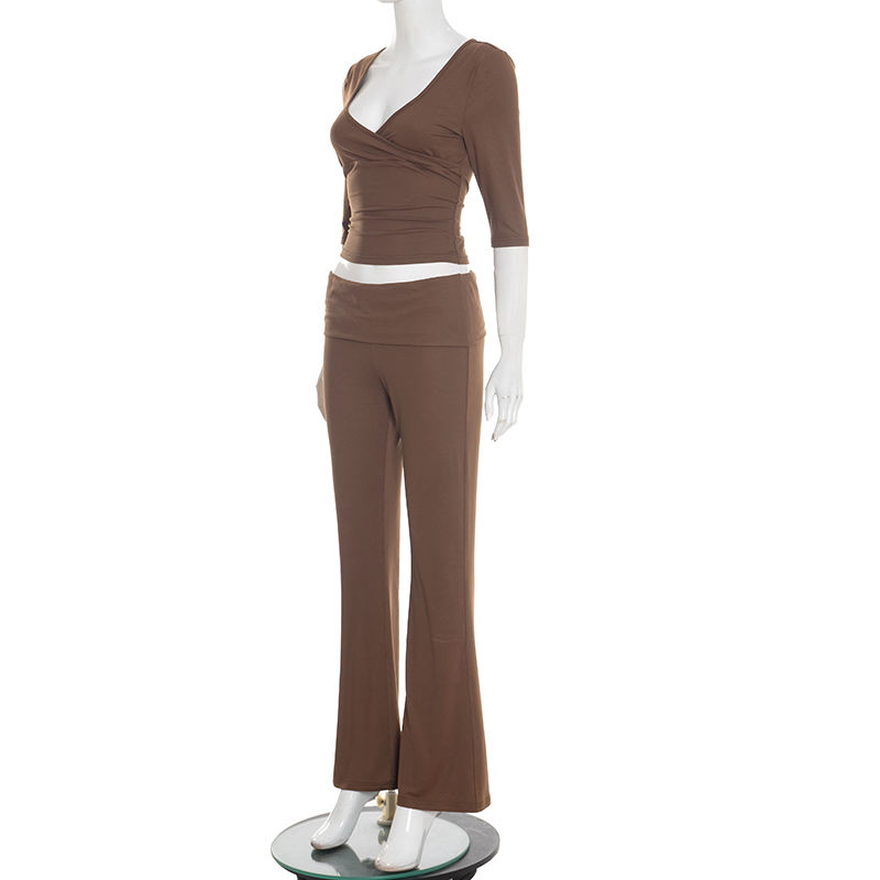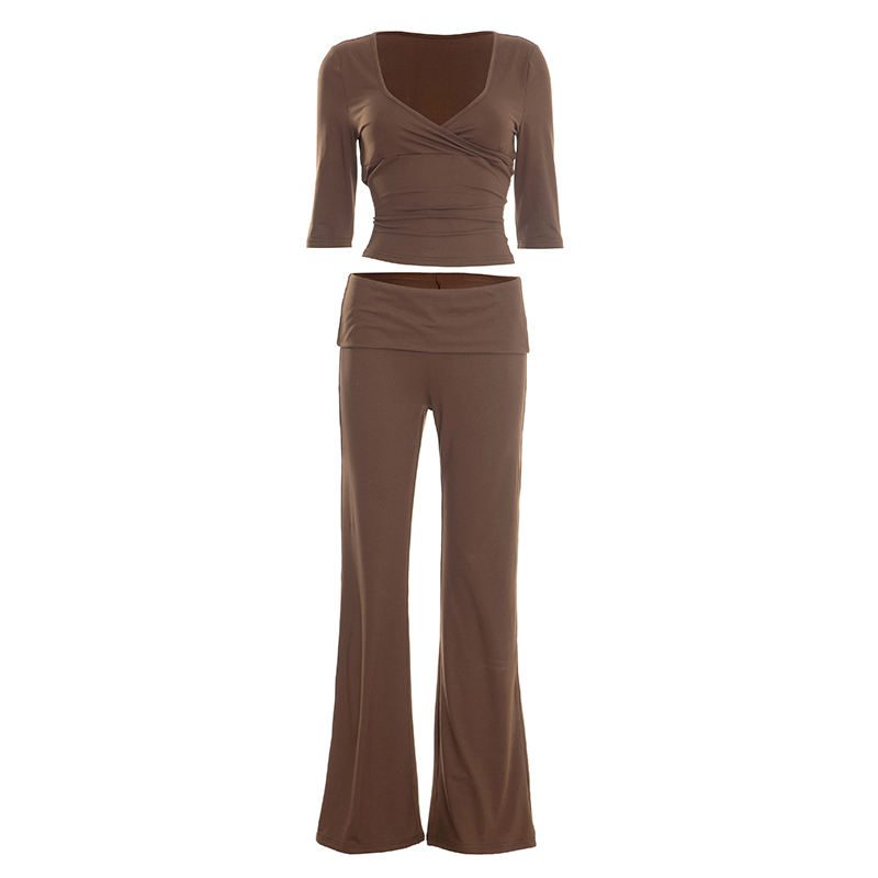 Viviblook Q25ST471 Women Casual Yoga Suit Long Sleeved V-Neck T-Shirt Crop Top Long Pants Two Piece Set