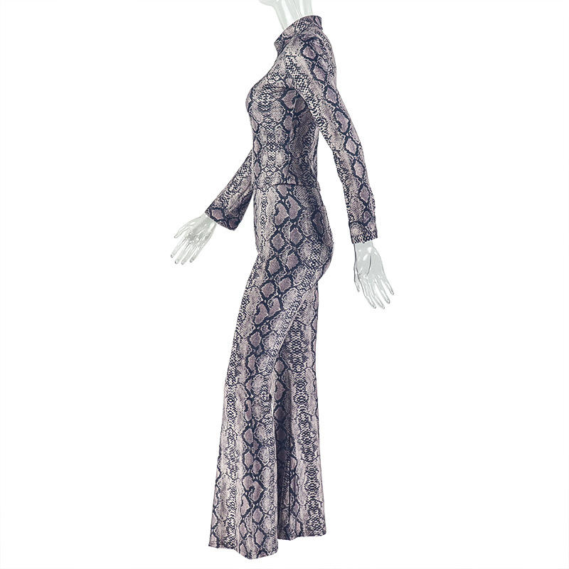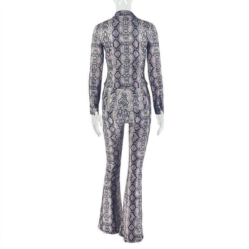 ชุดเซ็ตผู้หญิง Viviblook Z0120ST01 ลายหนังงู เสื้อคาร์ดิแกนคอตาข่ายติดซิป กางเกงขาบาน ชุดสองชิ้น