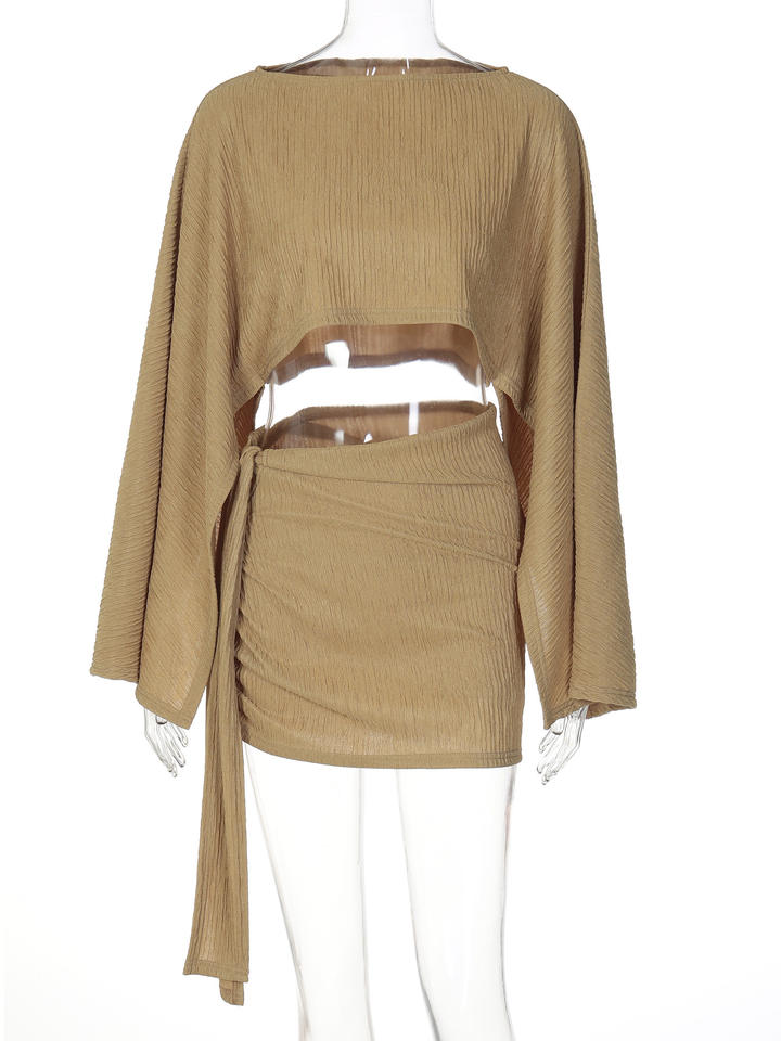 ชุดเซ็ตวันพักผ่อนสำหรับผู้หญิง Viviblook Z0128ST01 เสื้อครอปเปิดไหล่คอเฉียง สายรัดไหล่ กระโปรงสั้นเข้าชุด สองชิ้น