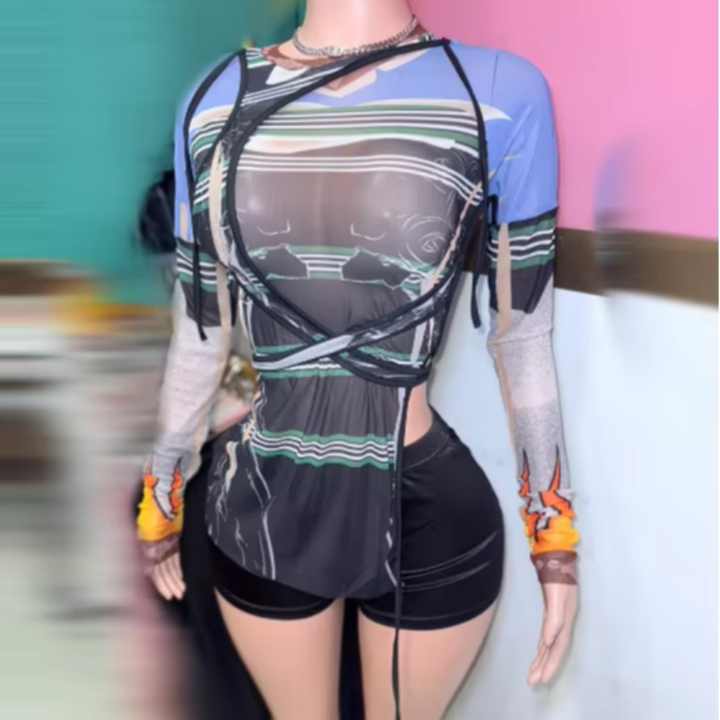 Viviblook ชุด Z1010ST03เซ็กซี่ของผู้หญิงชุดเสื้อผ้า2ชิ้นสำหรับผู้หญิงเสื้อทรงหลวมผ่าลูกไม้แหวกแนว