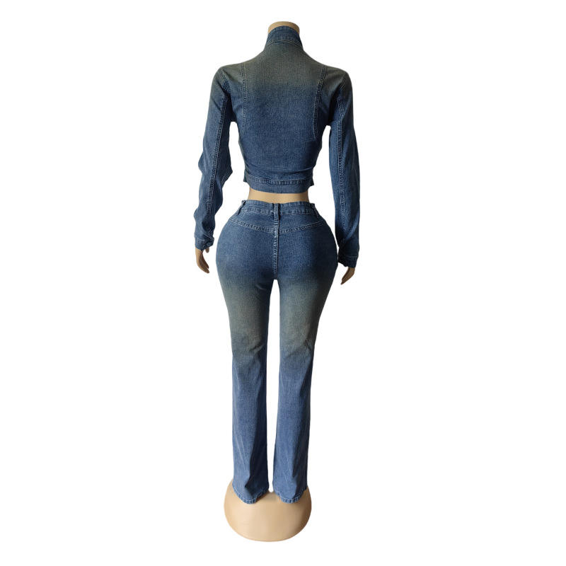 ชุดเดนิมสไตล์วินเทจ Viviblook Z1105ST01 สำหรับผู้หญิงไซส์พลัส ชุดใหม่ เสื้อแจ็คเก็ตแขนยาวยืดหยุ่น กางเกงขาบาน