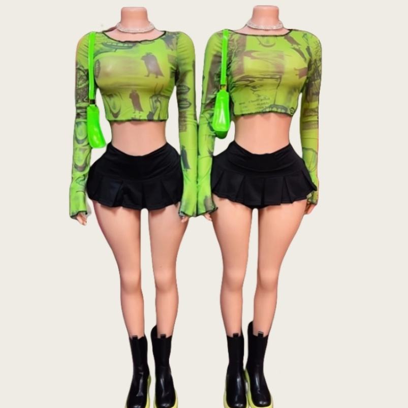 Viviblook ชุดสองชิ้นสำหรับผู้หญิง Z1217ST04เสื้อยืดแขนยาวผ้าตาข่ายแบบยืดหยุ่นชุดสองชิ้น