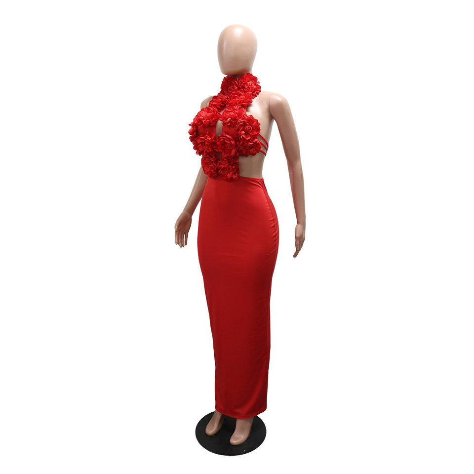 ชุดเดรสผู้หญิงไซส์ใหญ่ Viviblook รุ่น Z225DS06 แบบเซ็กซี่ สายคล้องคอ ไร้แขน เปิดหลัง ตัดเย็บลายดอกไม้ 3 มิติ สีแดง สำหรับงานเลี้ยงกลางคืนหรืองานวันเกิด