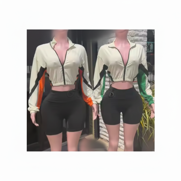 Viviblook Z424ST01 Women's Casual Sports Tracksuit Plus Size Patchwork Color Zipper Long Sleeved Slim Shorts Two-Piece Set