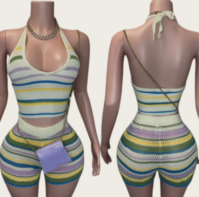 Viviblook ชุดสองชิ้น Z711ST06ผู้หญิงชุดเสื้อคล้องคอเปิดหลังชุดเสื้อกางเกงขาสั้นถัก