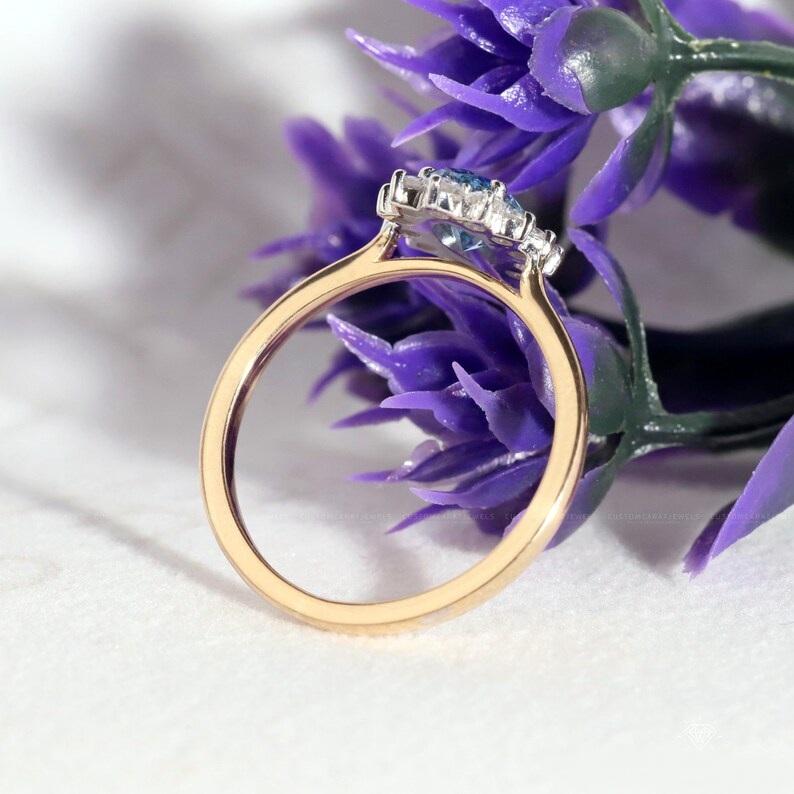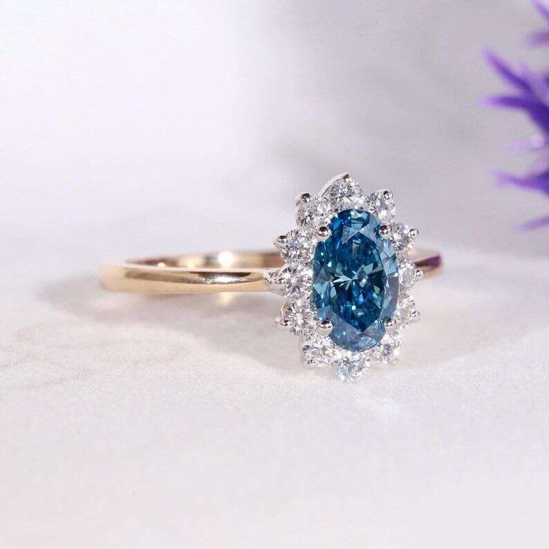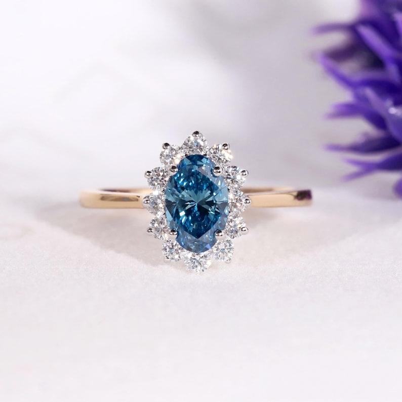 แหวนโมอิสซาไนต์ทรงไข่สีฟ้าสดใส ประดับเฮโล