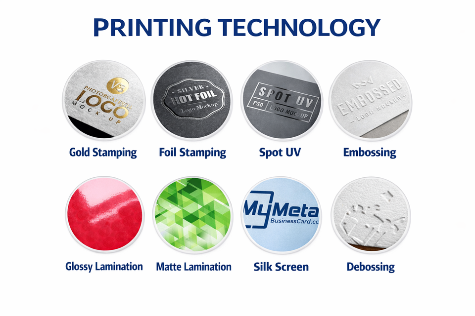 การจัดการการพิมพ์:แมตต์เคลือบ, เคลือบเงา, การตอก, ลายนูน, เคลือบเงา, เคลือบยูวี, หายไป, ทองฟอยล์