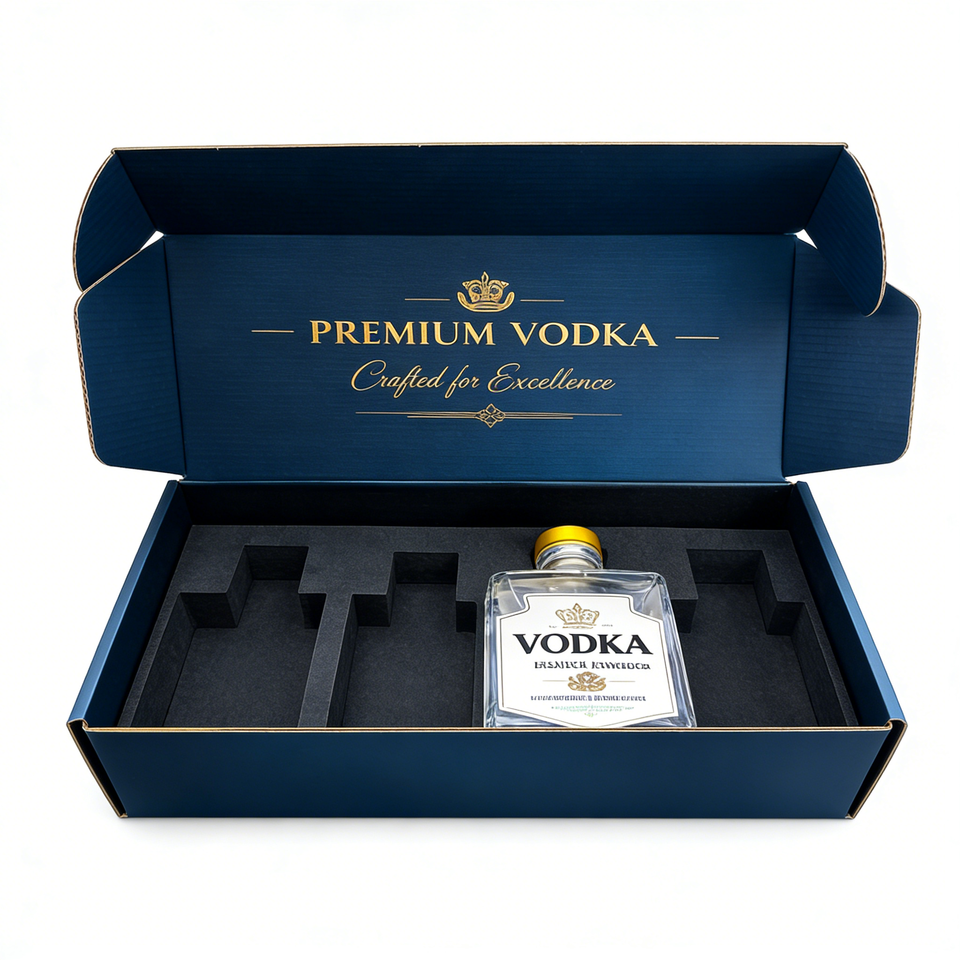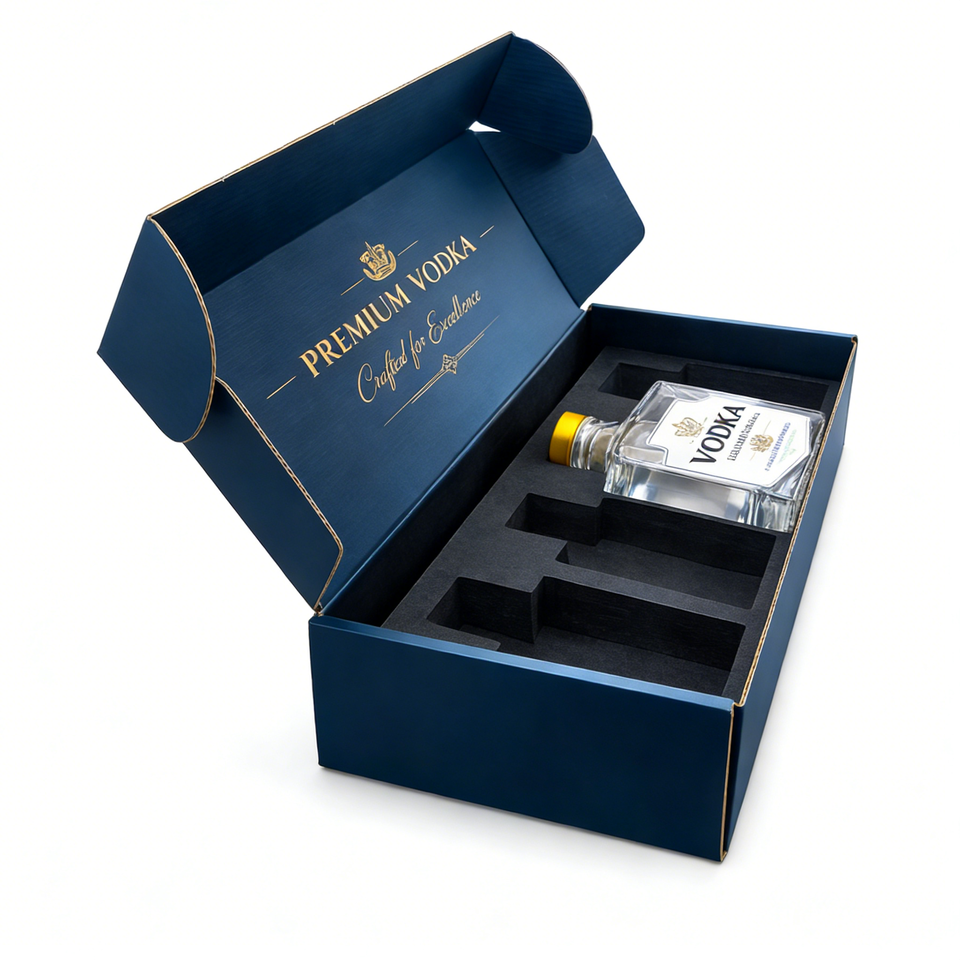 กล่องบรรจุภัณฑ์เครื่องดื่มวอดก้าแบบกำหนดเอง กล่องไปรษณีย์พับได้ วัสดุลูกฟูก B E Flute ผู้ผลิตกล่องไปรษณีย์
