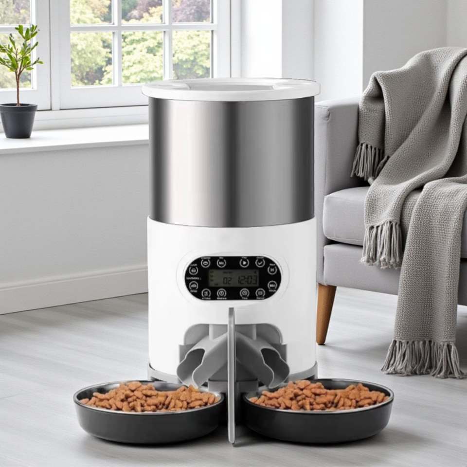 เครื่องให้อาหารสัตว์เลี้ยงอัตโนมัติขนาด 4.5 ลิตร พร้อมบันทึกเสียง ถาดอาหารสแตนเลส 304 ดีไซน์ทันสมัย หน้าจอ LCD รูปทรงโค้งมน สำหรับสัตว์เลี้ยงขนาดเล็ก