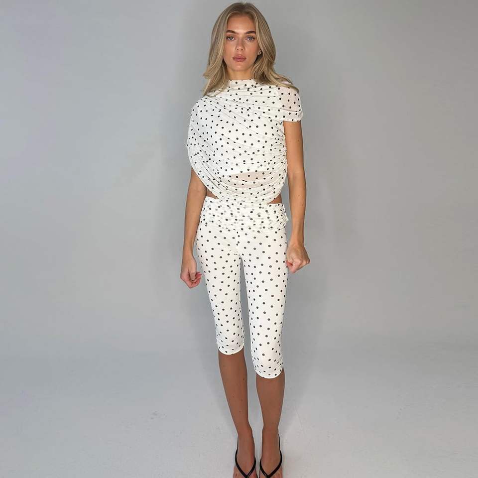 ชุดเซ็ตเสื้อครอปคอสูงลายจุดพร้อมกางเกงขายาวผ้าตาข่ายซีทรูสำหรับผู้หญิงจาก Voikerdr เหมาะสำหรับใส่ไปเที่ยวคลับ
