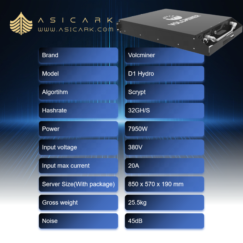Volcminer D1 Hydro 32G Scrypt Hydro-cooling Metal 380V LTC เครื่องขุดเหรียญโดจคอยน์ประสิทธิภาพสูง 7950W 50dB ฟาร์มขุดเหรียญ ASIC