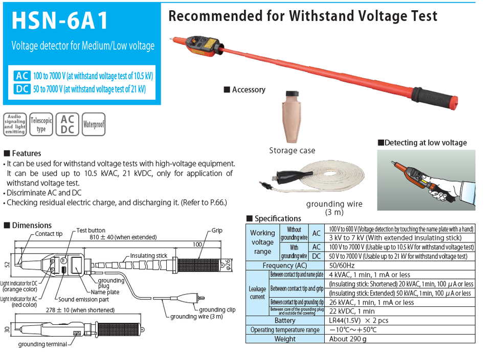 เครื่องตรวจจับแรงดันไฟฟ้า HSN-6A2 AC DC 80-7000V ทดสอบแรงดันไฟฟ้าได้ถึง21kV ผลิตในประเทศญี่ปุ่น