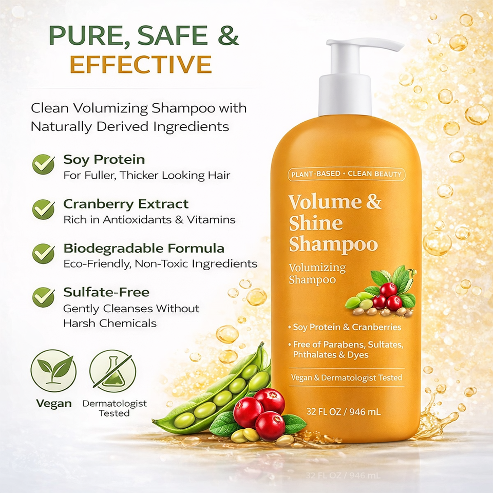 แชมพูเพิ่มวอลลุ่มสำหรับผมบาง แชมพูเพิ่มความเงางามด้วยสารสกัดจากโปรตีนถั่วเหลืองและแครนเบอร์รี่ สูตรจากพืชธรรมชาติสำหรับคนทานวีแกน