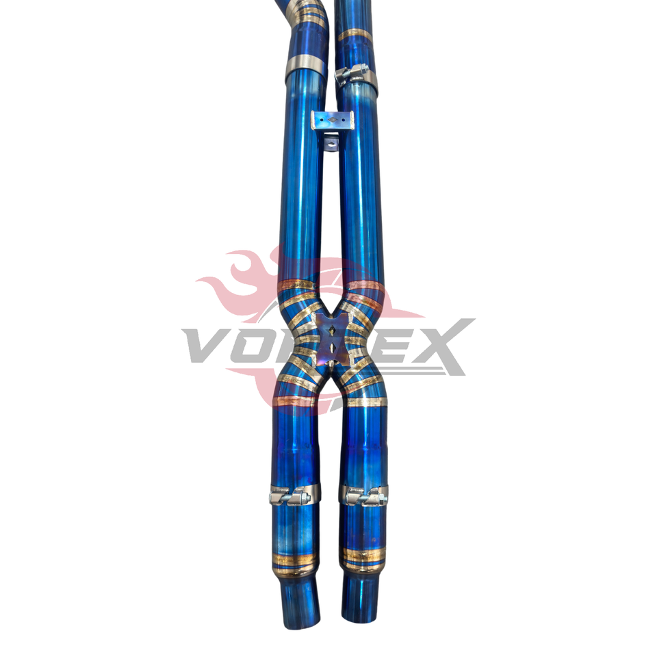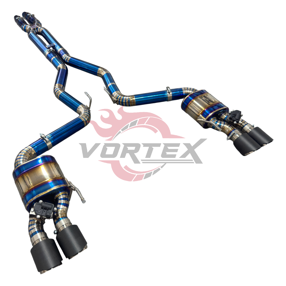 ปลายท่อไอเสีย Vortex Titanium พร้อมวาล์วปรับเสียงแบบ Aggressive/Mild สีฟ้าเบิร์น สำหรับรถมัสแตง 5.0 GT V8 ปี 2015-2017