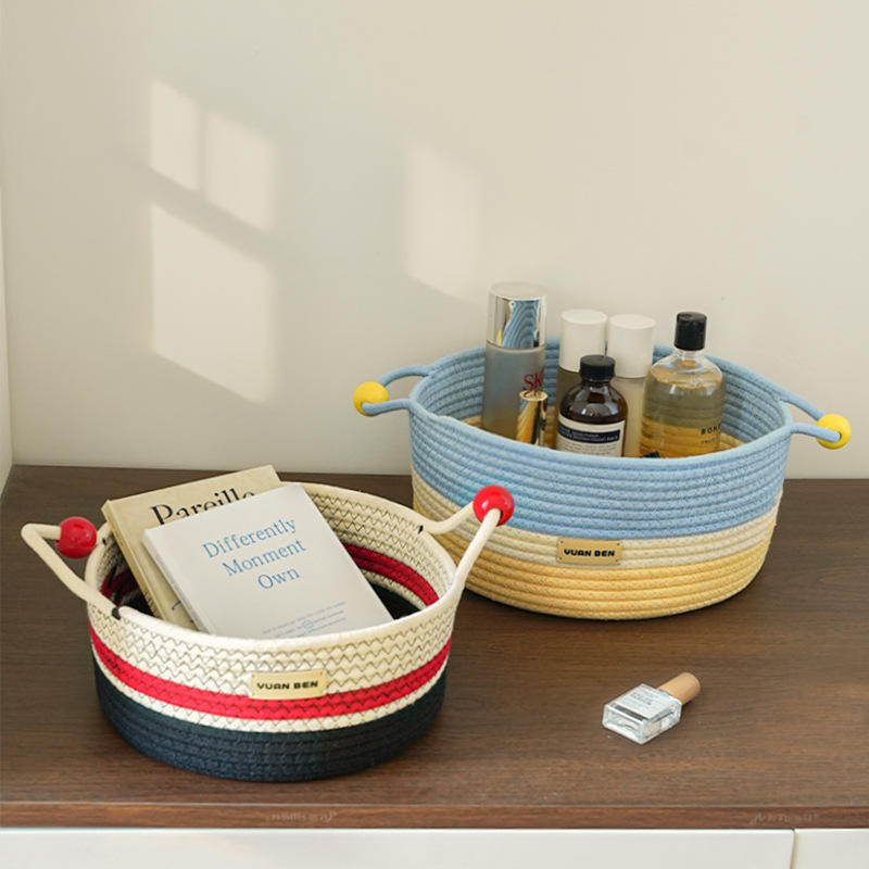 ตะกร้าเก็บของเชือกฝ้ายววนเบนทรงกลม ทำด้วยมืออเนกประสงค์ สำหรับจัดระเบียบของเล่น ขนม ของจุกจิก ความจุขนาดใหญ่